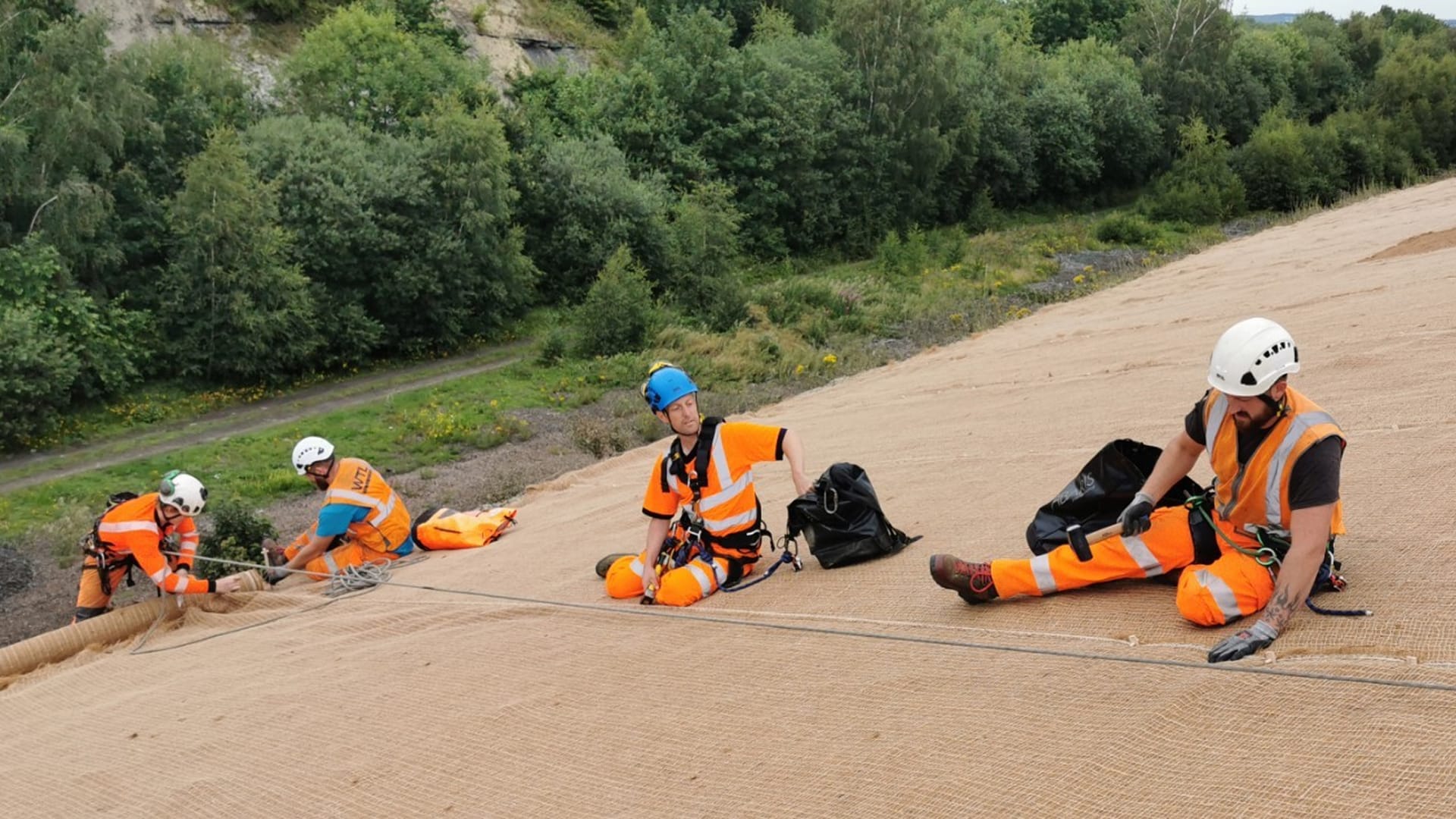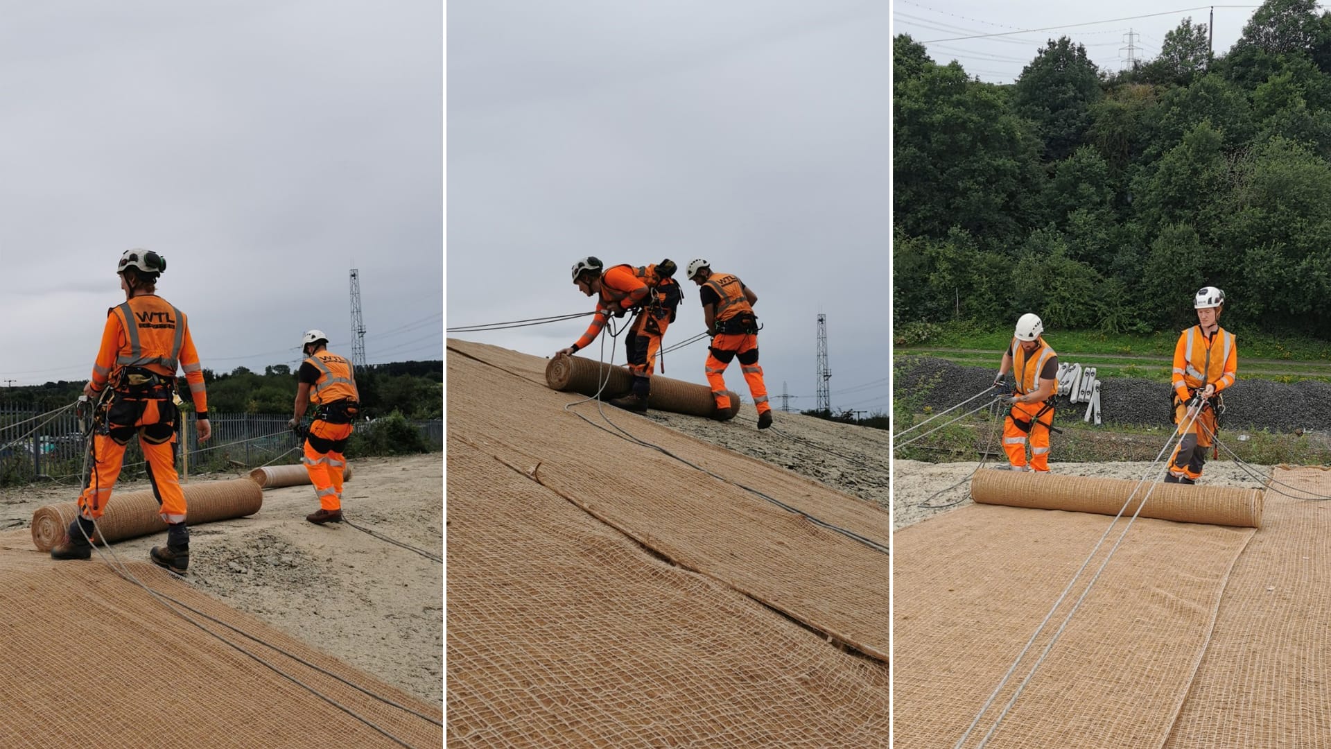 Our operatives hold IRATA Level 1, 2, and 3 rope access qualifications, enabling safe setup and movement across the steep slope. Working from ropes, the team rolled and pinned the blanket in place with precision. The combination of rope access skills with vegetation management training, including chainsaw and brush cutter use, highlights WTL’s ability to deliver complex works safely and efficiently