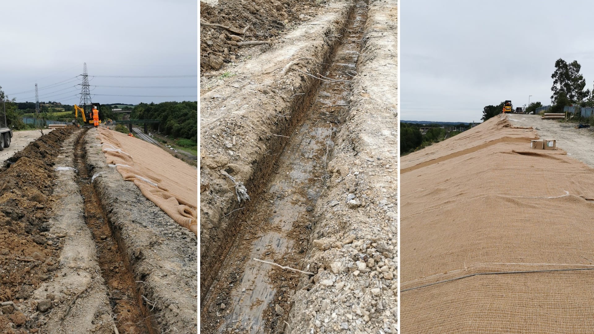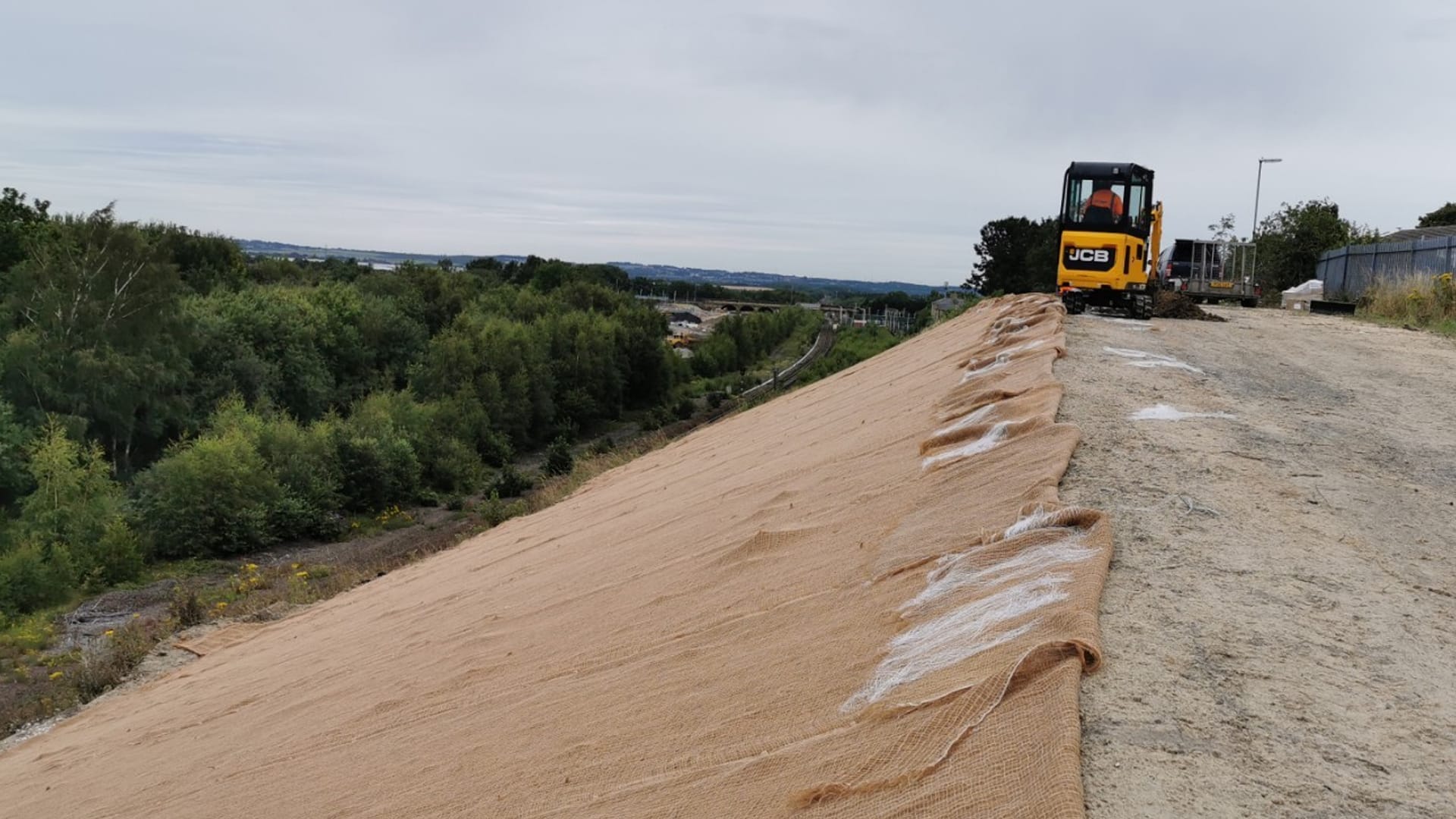 Using 300mm wooden pins supplied by the manufacturer, we rolled out the erosion control blanket with a 75mm overlap to ensure full coverage. At the crest of the embankment, our team excavated a150mm x 150mm anchor trench with a 1.5t JCB. This trench secured the blanket firmly at the top edge, preventing slippage and ensuring long-term performance