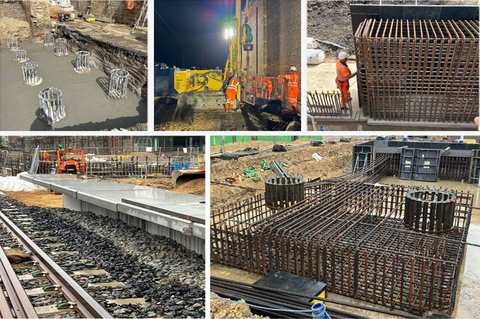 The scope included the installation of piling platforms and 98 rotary bored piles, along with the construction of pile caps both inside and outside the operational station footprint. The team also delivered a new platform structure using high output prefabricated Z units and coping stones, selected to reduce possession time and limit disruption to passengers. Extensive drainage and ducting installations formed part of the wider works package, all delivered in line with railway operational and safety requirements.